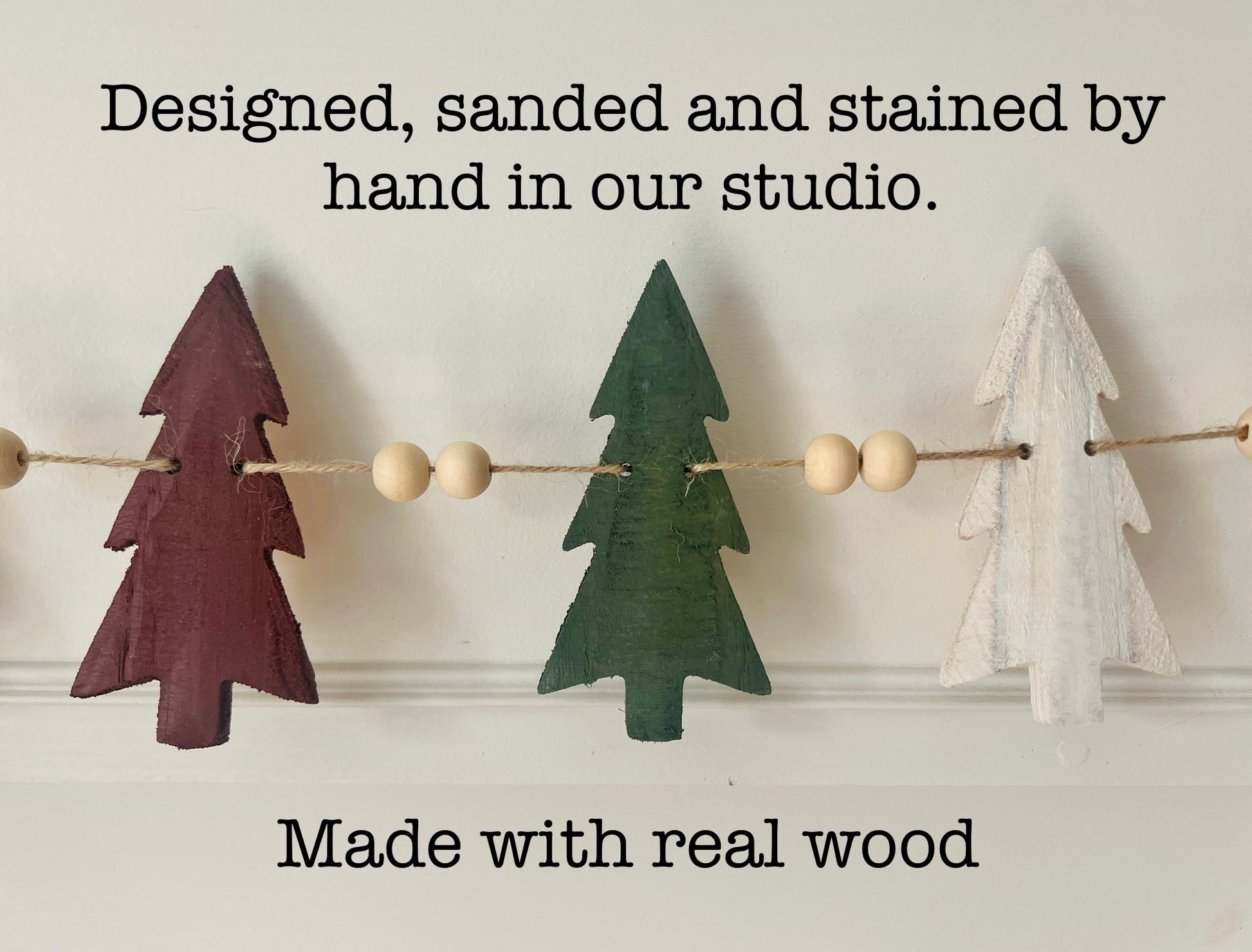 This garland offers dark red, dark green and white washed wooden trees handmade in our studio.
