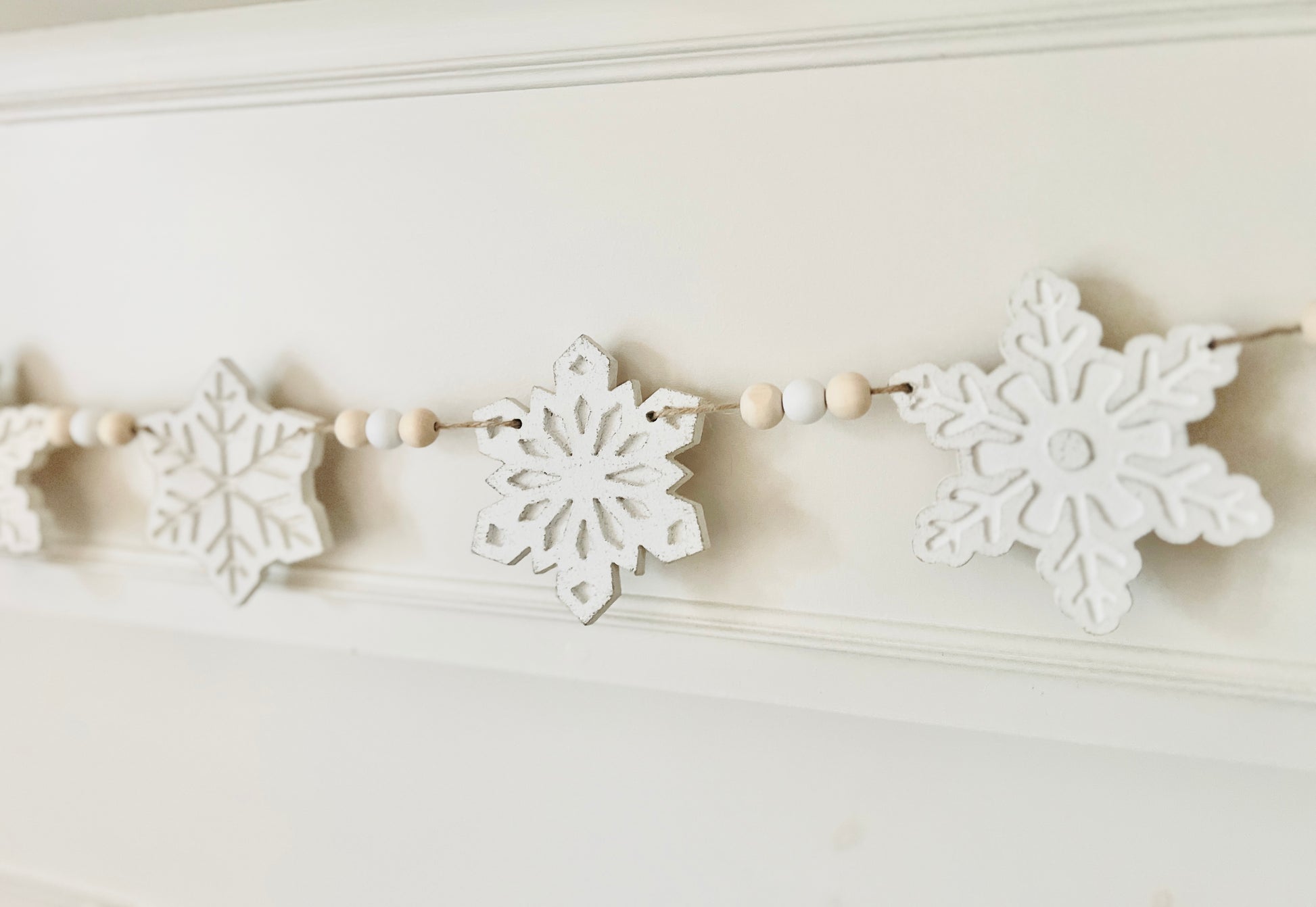 This listing is for a rustic snowflake garland for winter themed mantle decoration. The weathered white paint gives this garland a classic antique look. Choose the number of snowflakes you need and string upon arrival to place on your mantle, shelf or around the tree. Pieces come in a nicely presented zip-top bag, perfect for gifting.