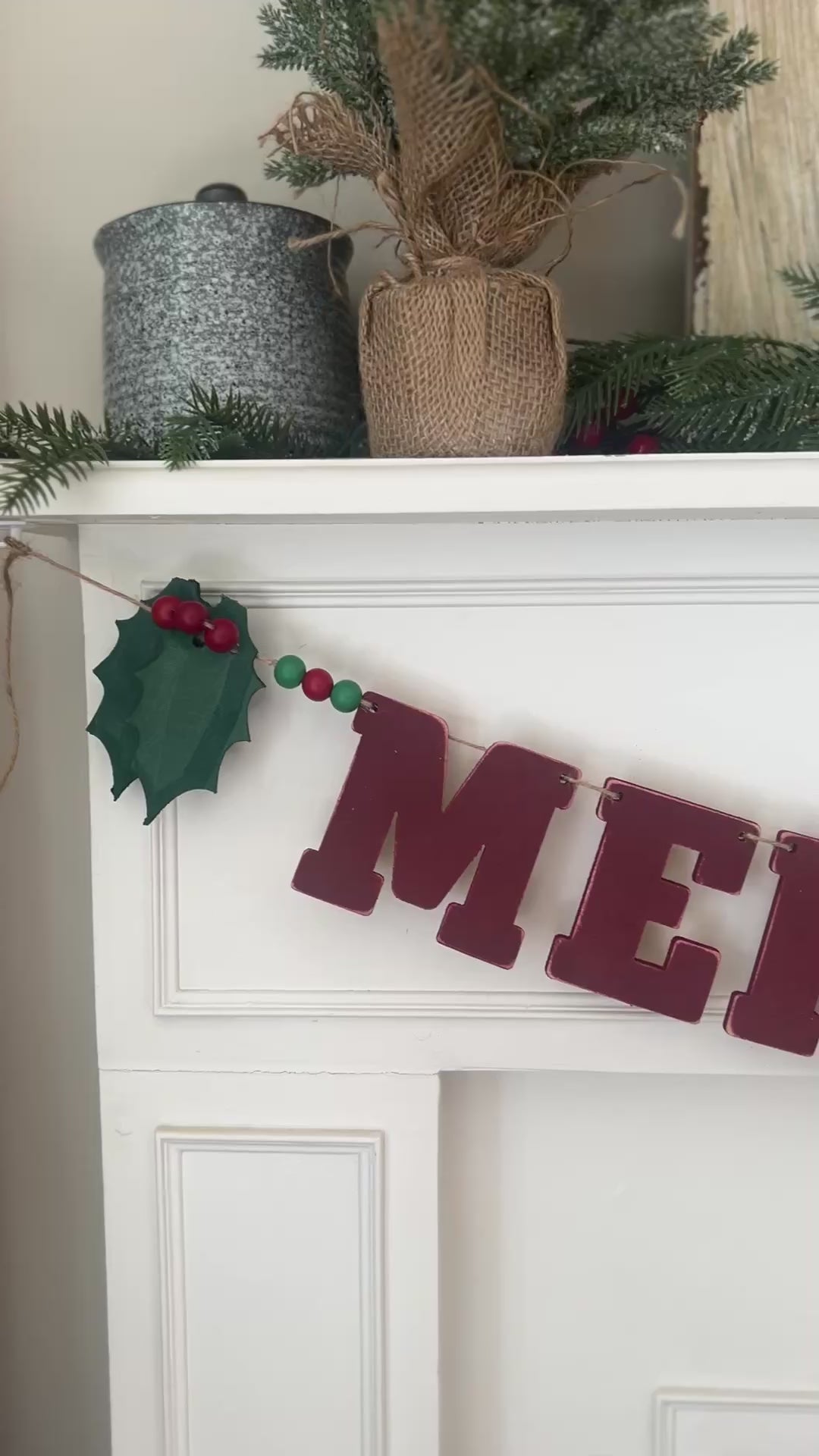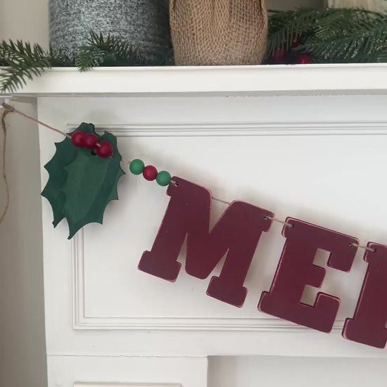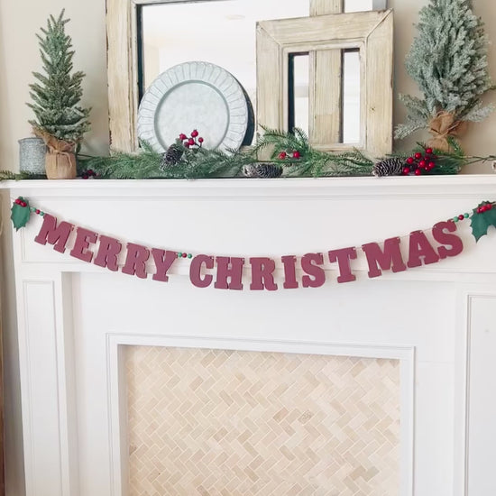 This easy to assemble Merry Christmas garland features 4” painted wood letters in vintage red. This grand holiday garland will generously span a 56-60” mantle/window.